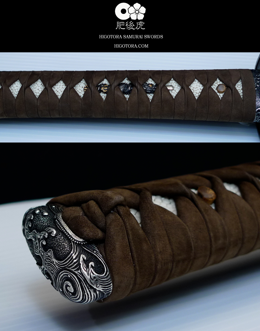 高波図銀古美縁頭 / 剣巻龍目貫・通常仕上 / 本鮫皮 / 本煤竹製目釘2本垂直打ち