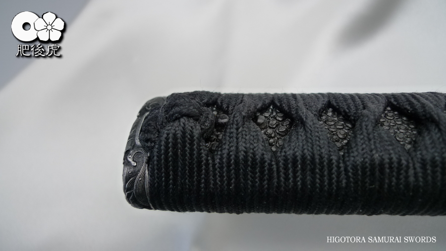 樋無し本造り(鎬造り)肥後虎同田貫刀身 / 直刃小乱刃文 / 親粒付・本鮫皮・黒染 / 正絹柄巻
