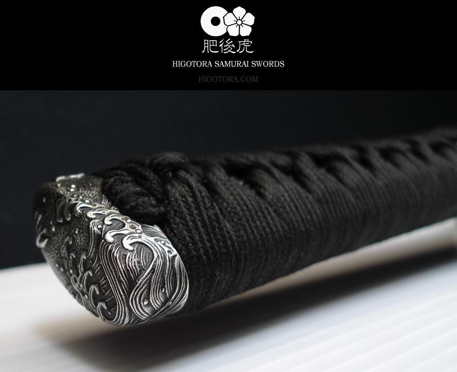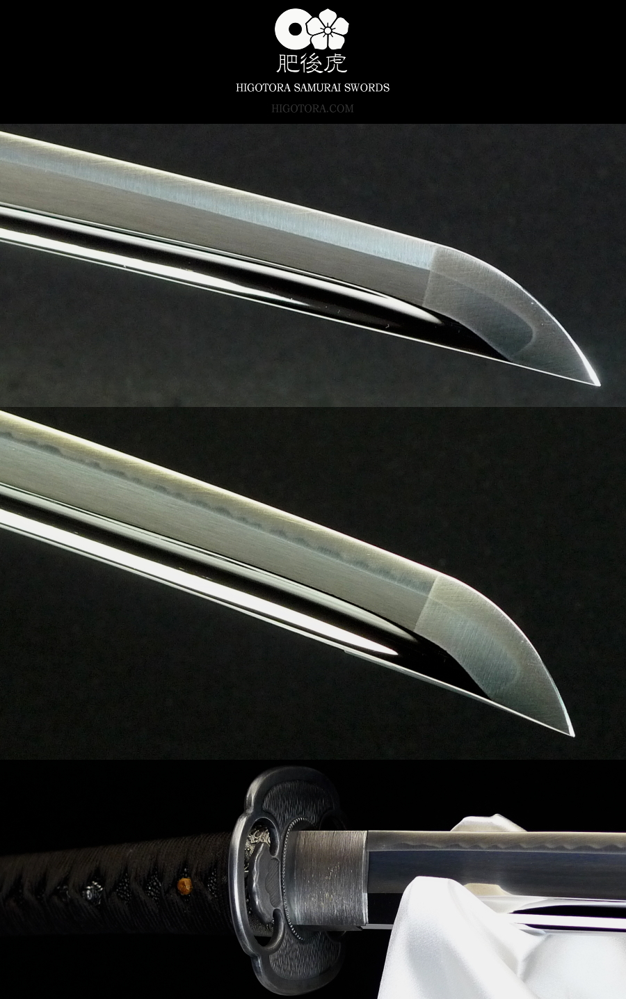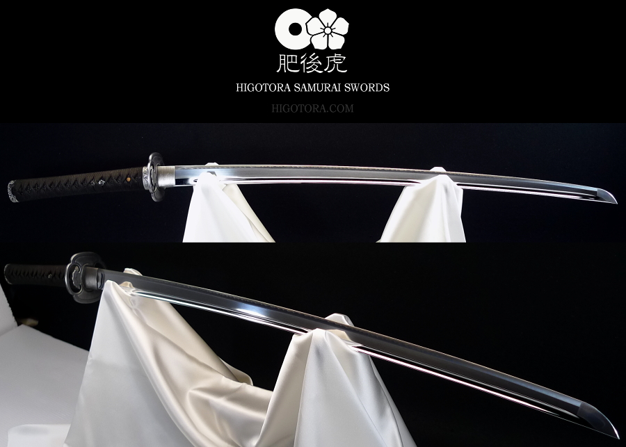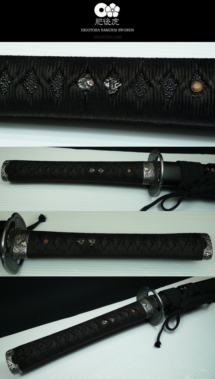 通常樋入り・鎬造・肥後虎同田貫刀身 / 直刃小乱れ刃文 / 肥後鍔銀古美 / 純綿(黒)巻き柄