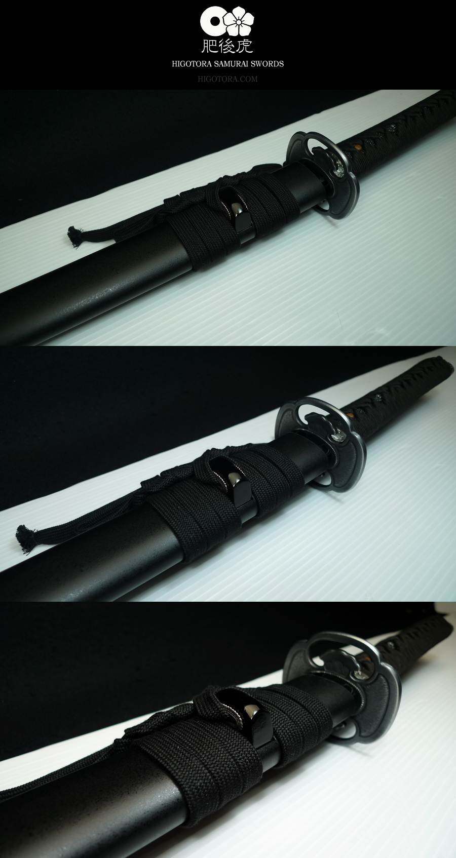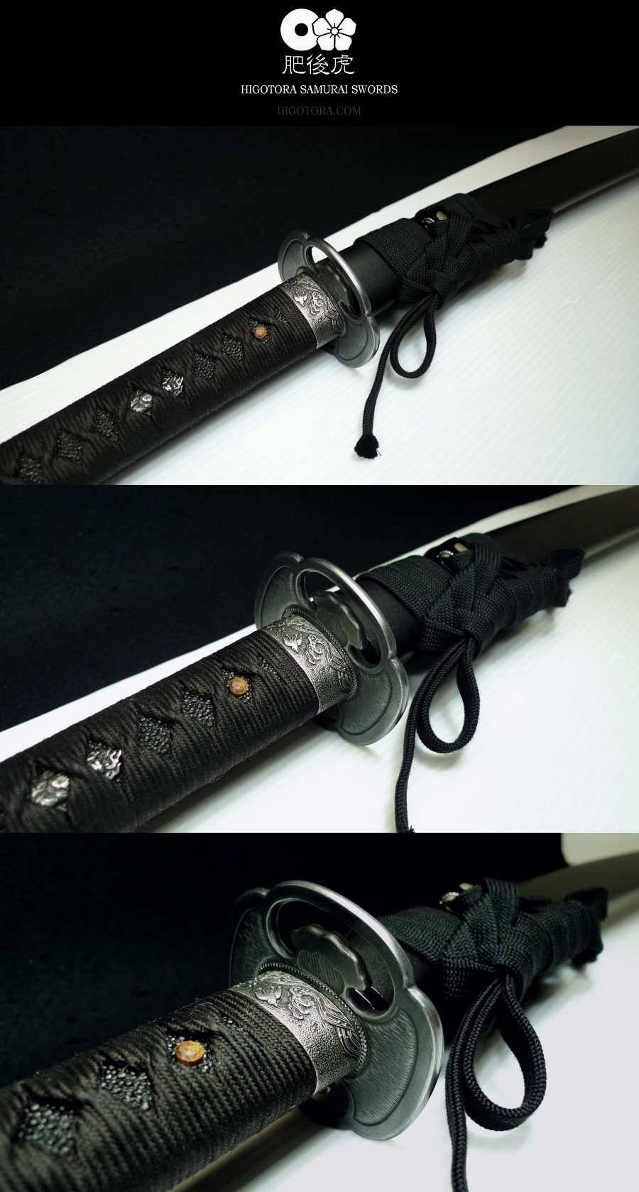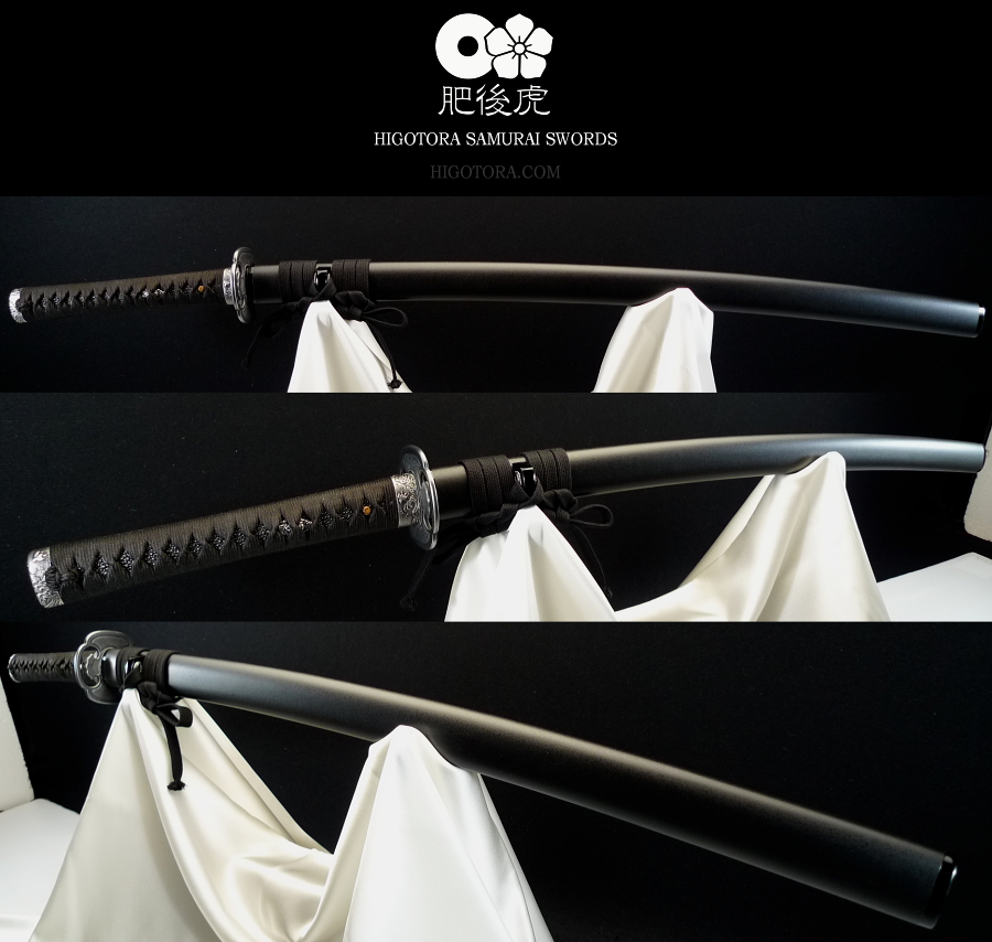 通常樋入り・鎬造・肥後虎同田貫刀身 / 直刃小乱れ刃文 / 肥後鍔銀古美 / 純綿(黒)巻き柄