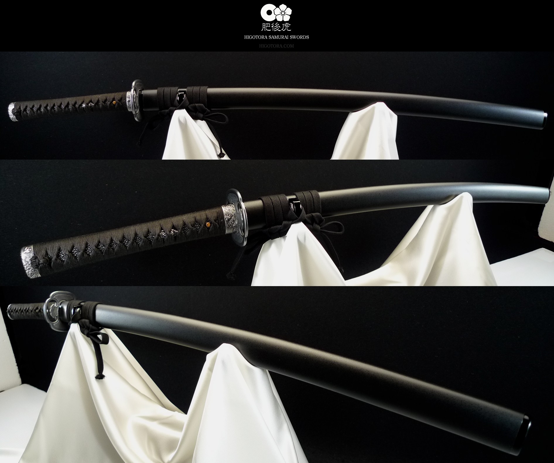 通常樋入り・鎬造・肥後虎同田貫刀身 / 直刃小乱れ刃文 / 肥後鍔銀古美 / 純綿(黒)巻き柄