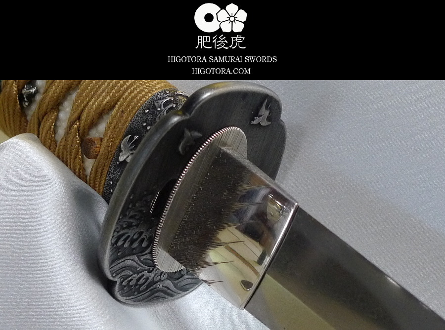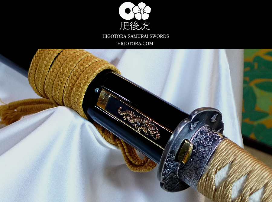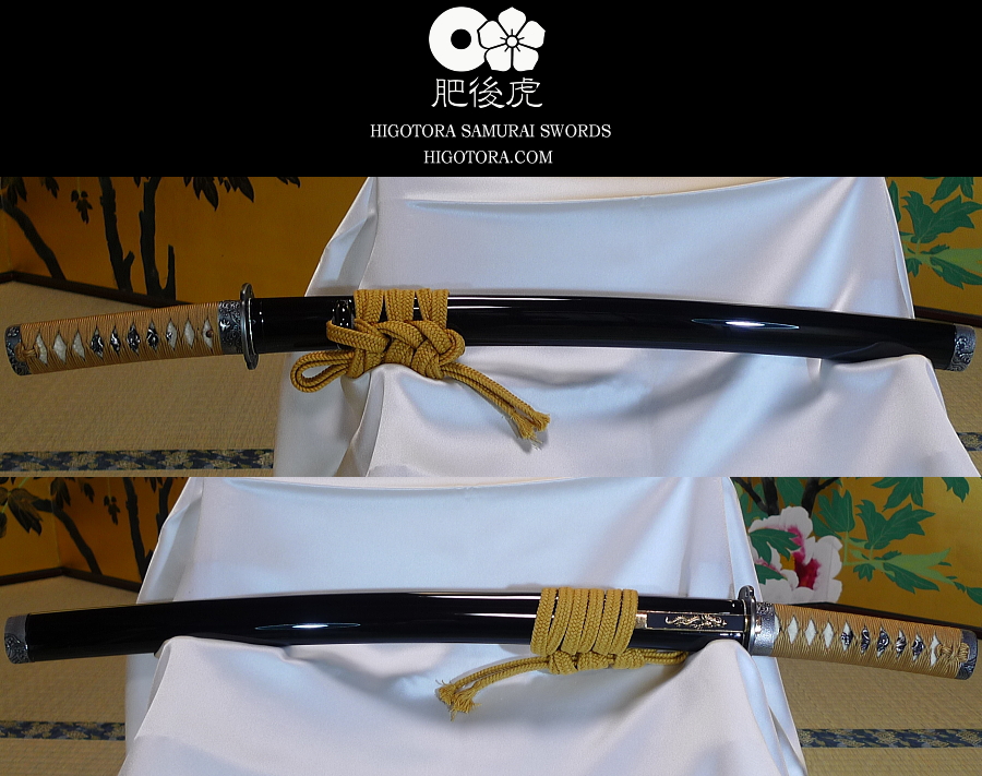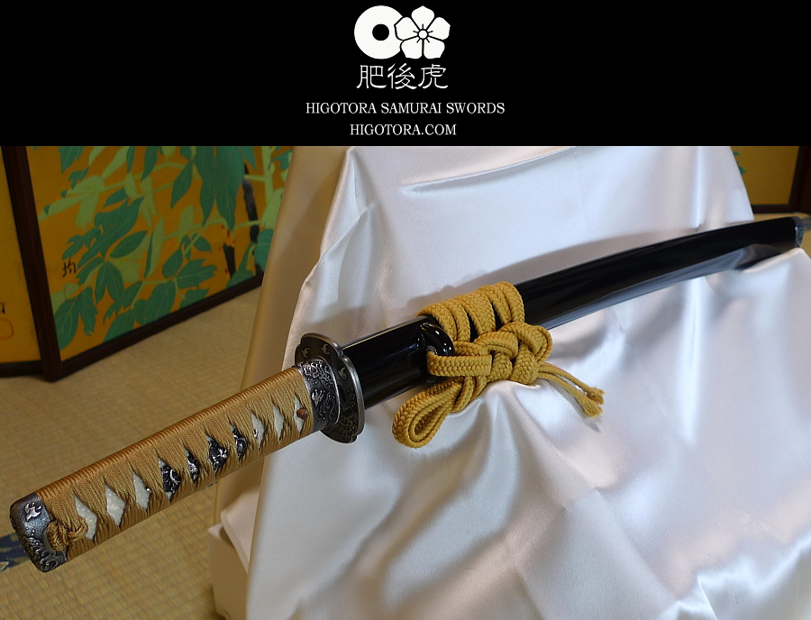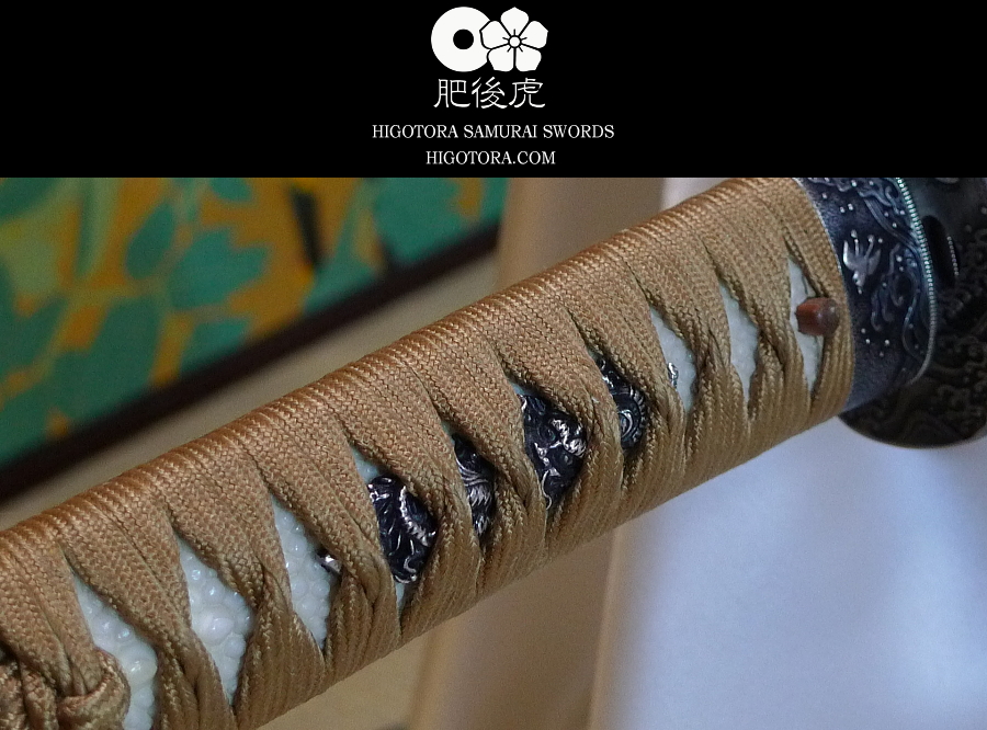 正絹金茶の柄巻、黒呂ツヤの鞘を合わせた、豪華さと重厚