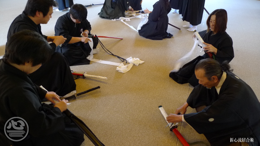 3![]() 東日本大地震・被災者の皆様へ心から哀悼の意を表し、参加者全員が日本刀の柄にさらしを巻き、厳粛に復興支援古武道大会が執り行われました。 |