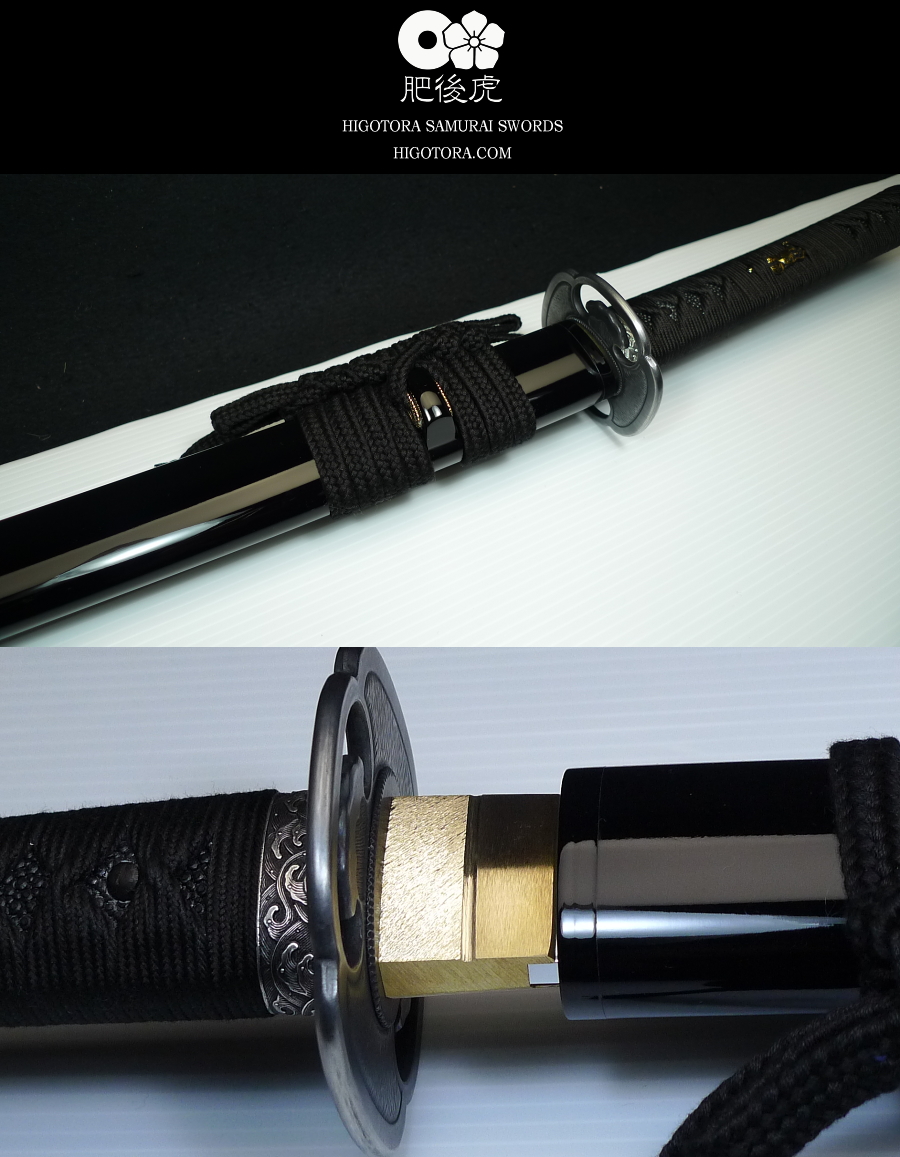 柄巻スタイル・一貫巻き / 黒蝋(本黒呂)塗り鞘 / 肥後平波銀古美縁頭 / 大虎目貫