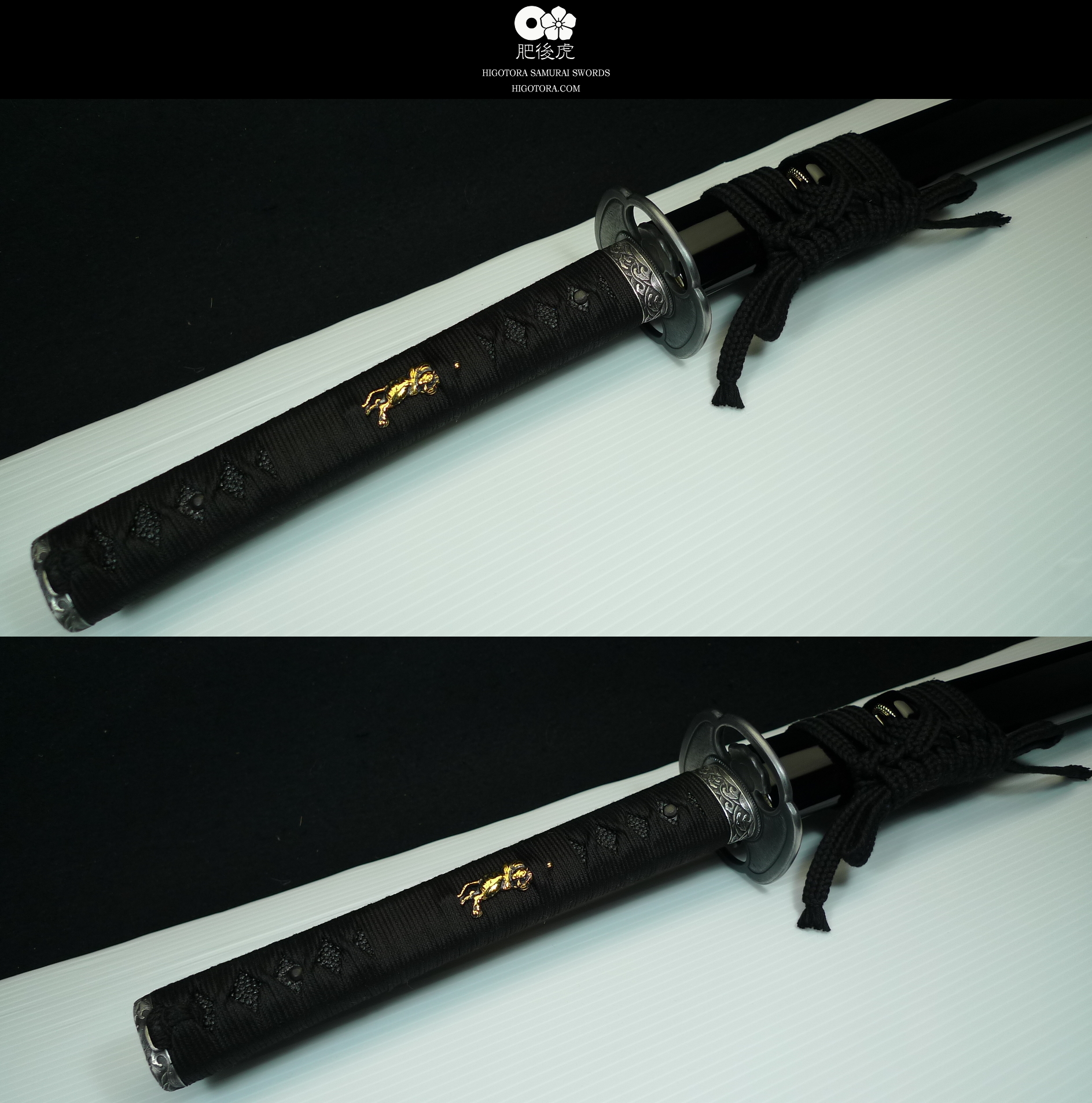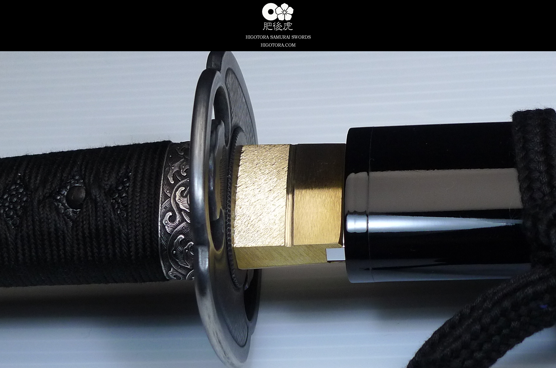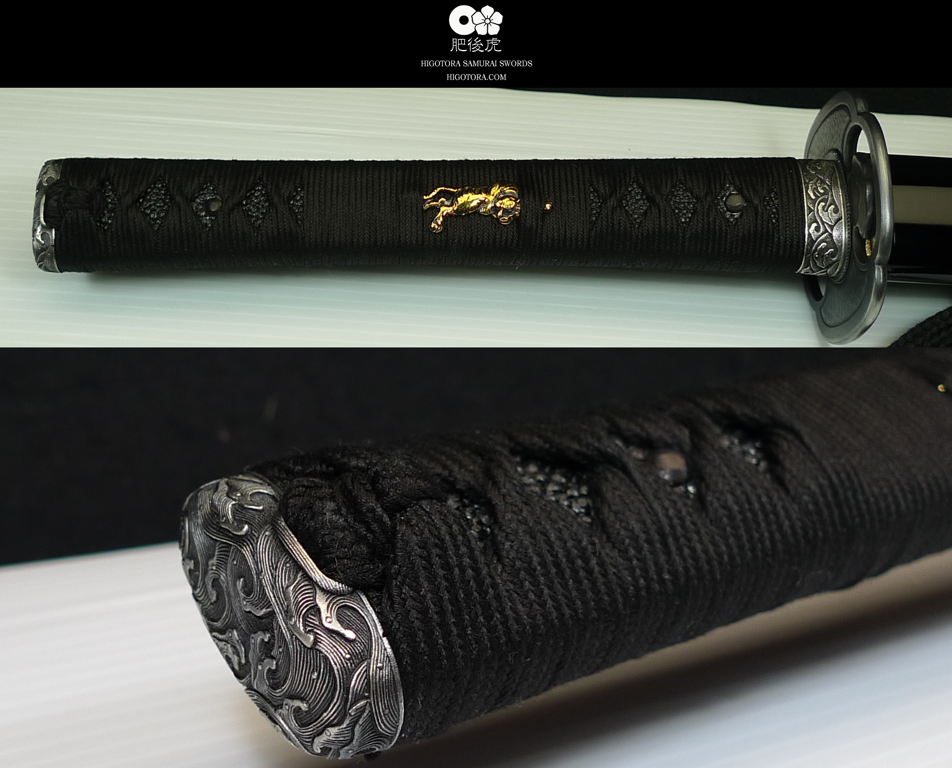 柄巻スタイル・一貫巻き / 黒蝋(本黒呂)塗り鞘 / 肥後平波銀古美縁頭 / 大虎目貫