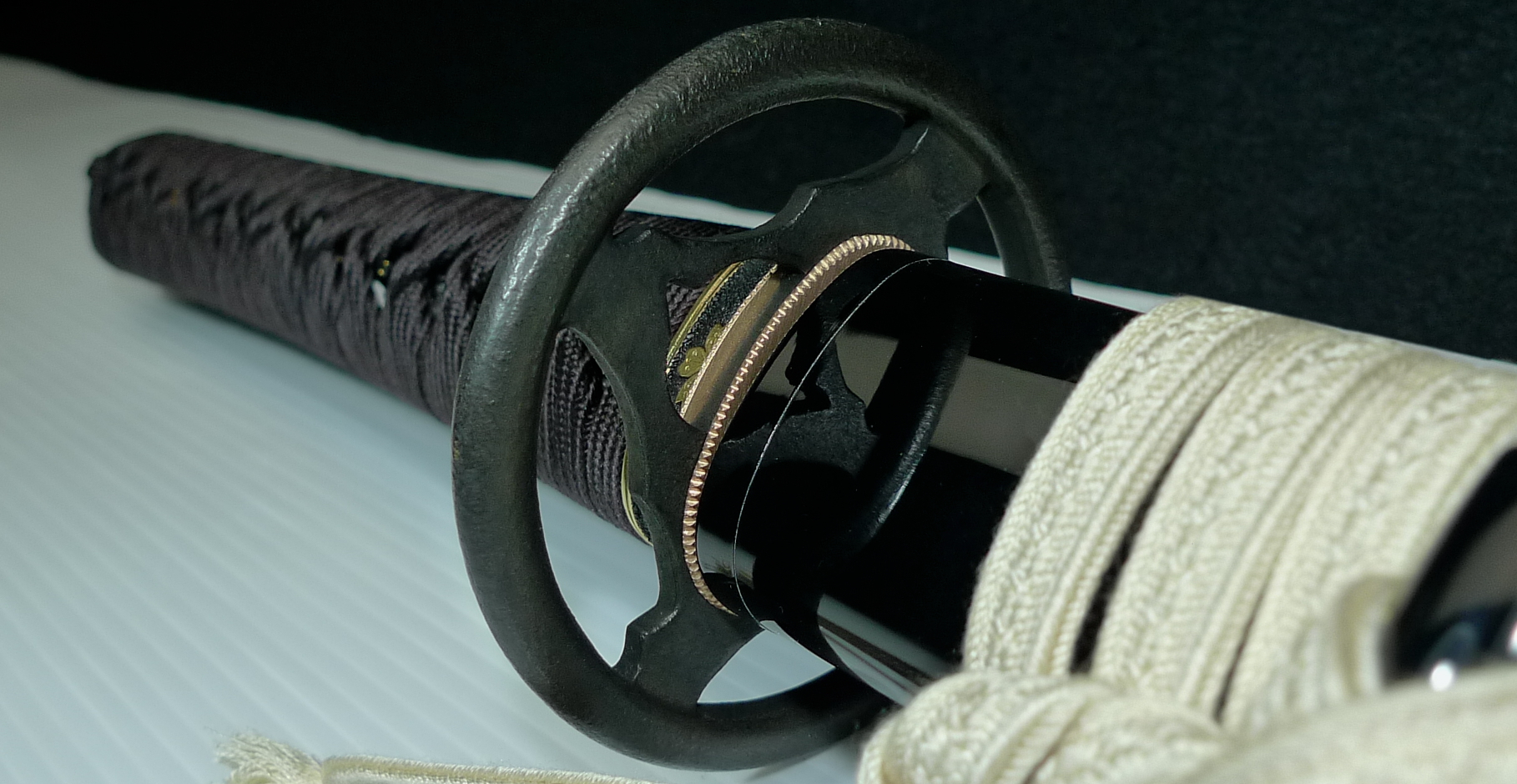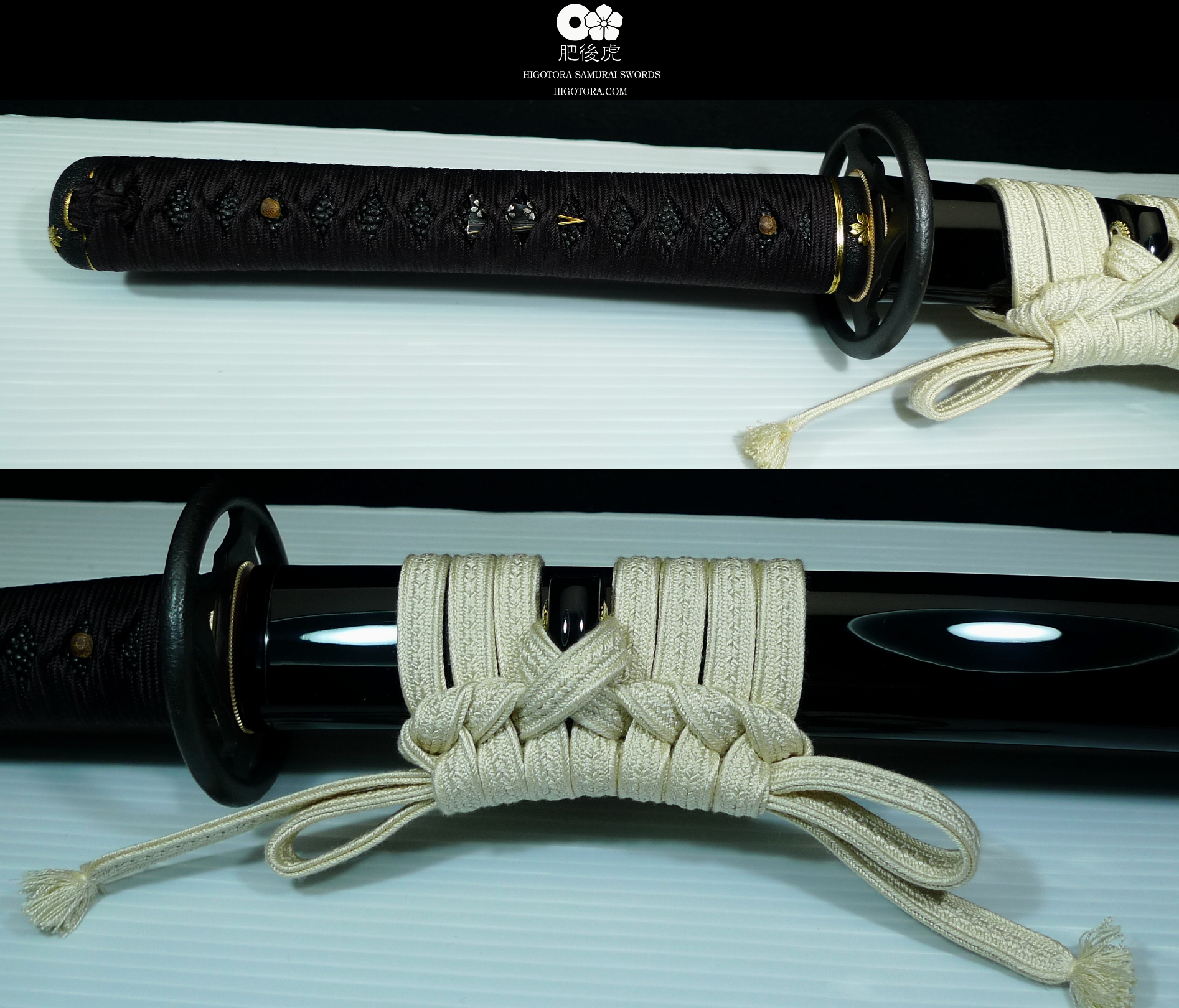 柄糸:正絹・時代黒 / 柄巻スタイル・捻り巻き / 本黒呂(黒蝋)塗り(上)鞘 / 肥後桜図・黒金・縁頭金具
