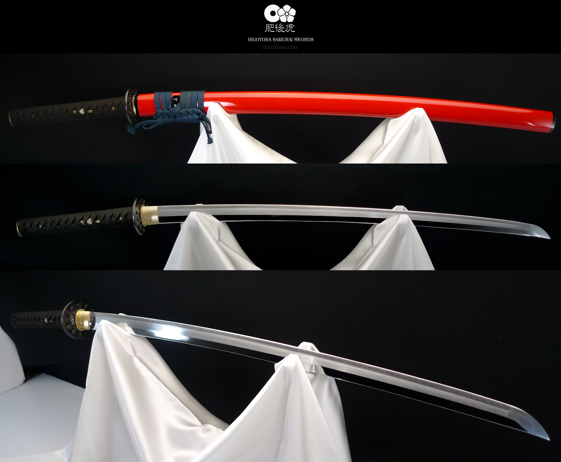 樋無し鎬造・肥後虎同田貫刀身 / 直刃小乱れ刃紋 / 波車図燻鍔 / 朱塗り鞘