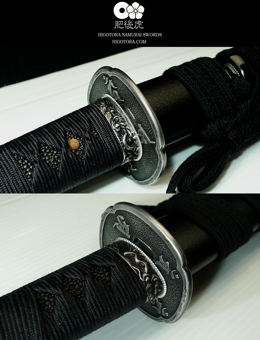 柄巻スタイル・一貫(片手)巻き(目貫2本巻止/目貫位置中央) / 本黒石目塗り鞘 / 美濃龍・銀古美・縁頭金具