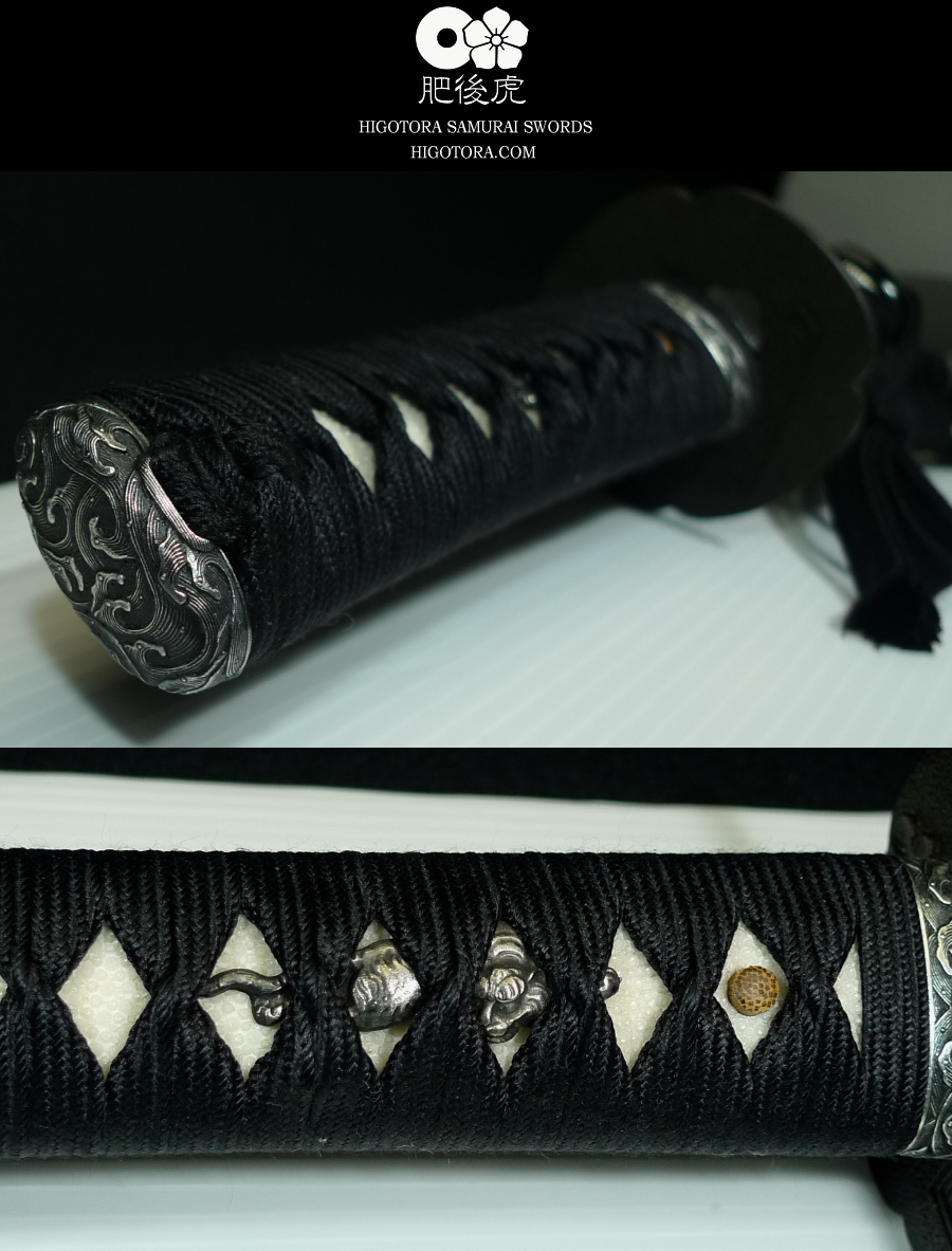 【1尺7寸・肥後虎同田貫脇差・銀古美金具・正絹巻】