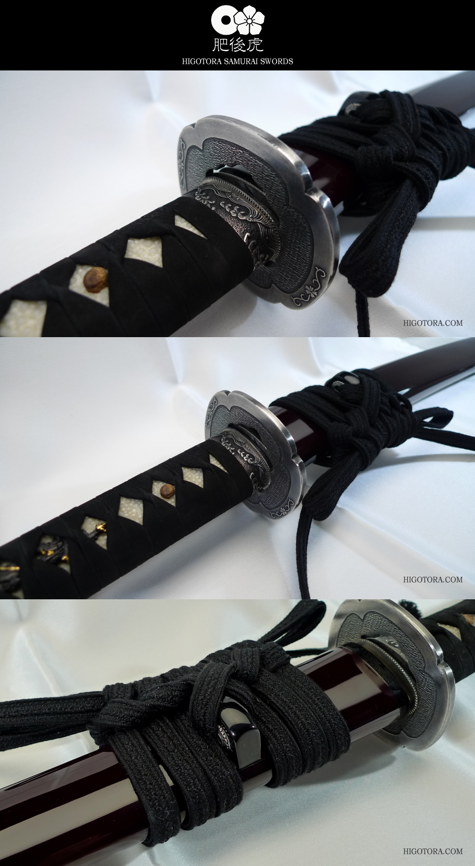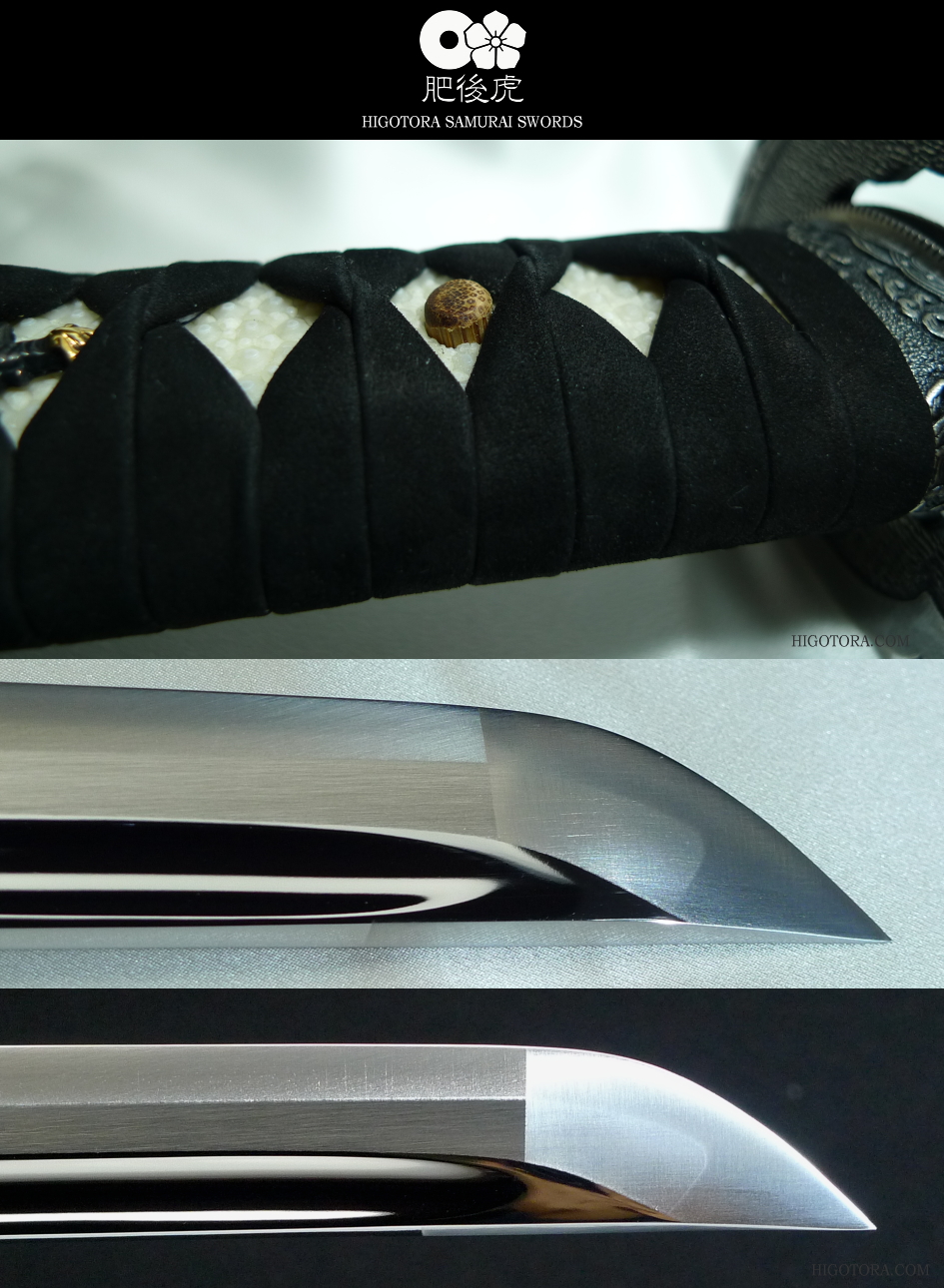 樋入り刀身 / 直刃二重刃文 / 本鮫皮 / 柄糸・牛革製・裏革・黒 / 柄長9寸5分 /