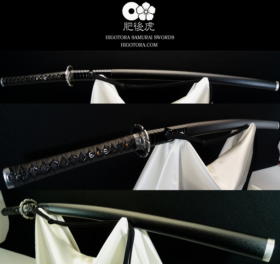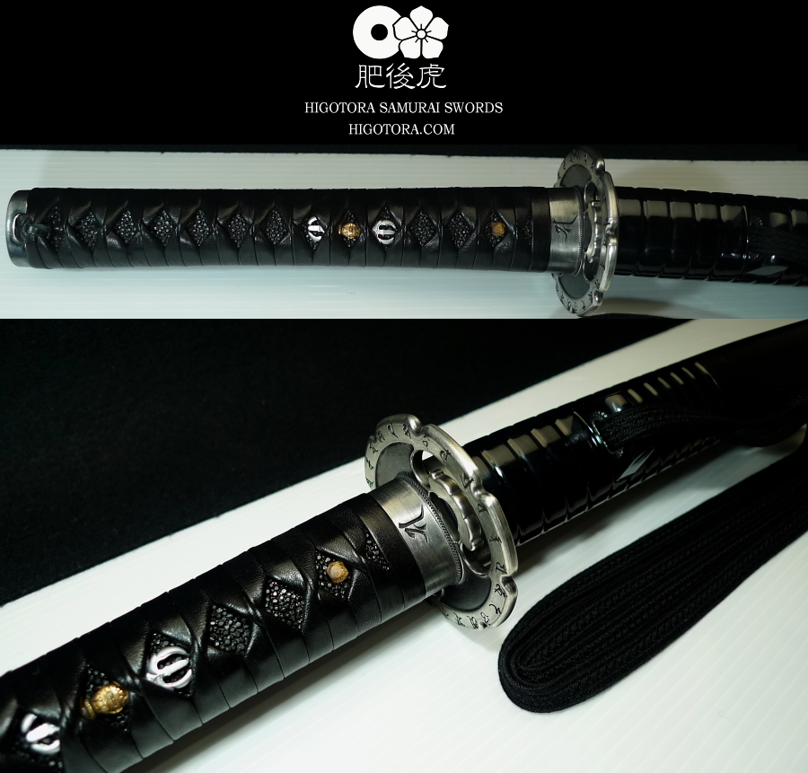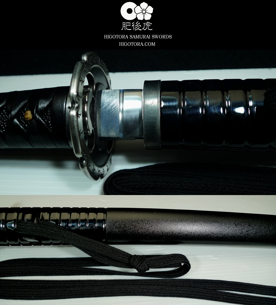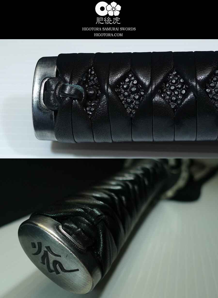8寸5分柄 / 柄糸・牛革・表革・黒 / 柄巻スタイル・捻り巻き / 部分千段・本黒呂・本黒石目塗分け鞘