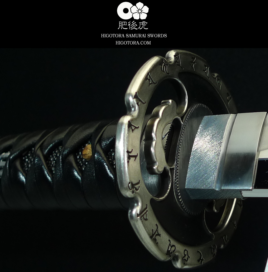 肥後虎 標準刀 真剣樋彫り刀身 / 九字兼定写し刃文 / 特注鍔(お客様にご提供頂いたデザイン画を元に製作した鍔)