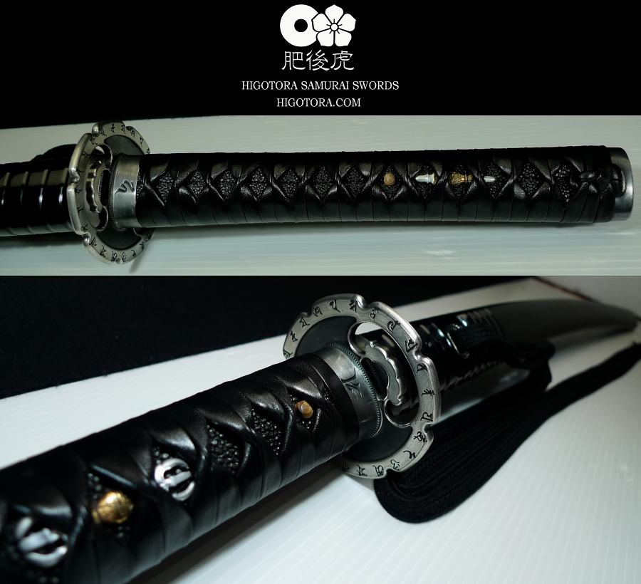 【フルオーダーメイド模擬刀・肥後虎刀 2尺4寸5分 特注鍔・真剣樋・革巻き・部分千段塗り分け鞘・銀古美金具】