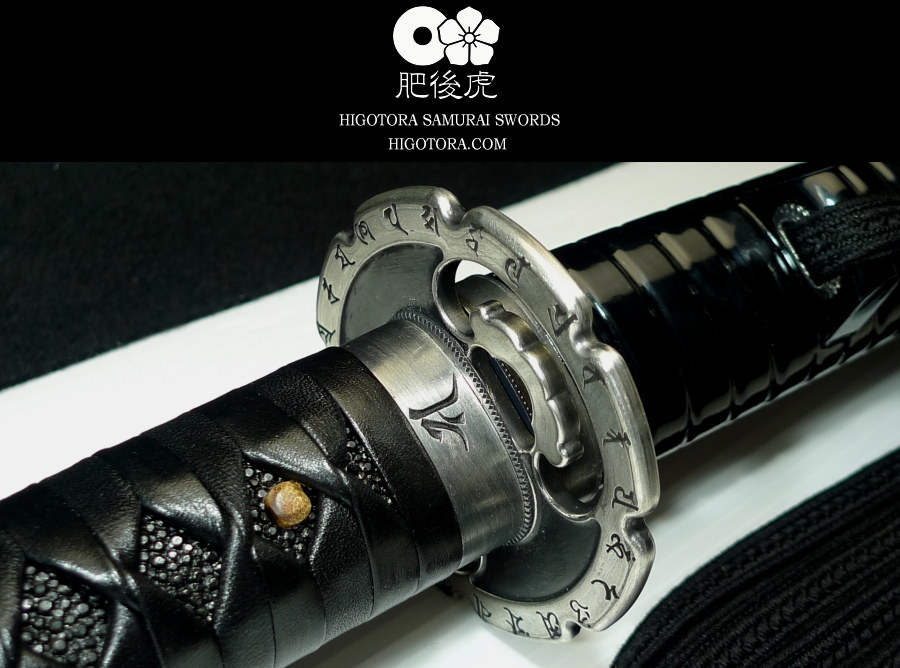 梵字・銀古美・縁頭金具 / 梵字・銀古美・鐺金具 / 独鈷剣・銀・金仕上げ目貫 / 黒染・親粒付・本鮫皮・腹合着