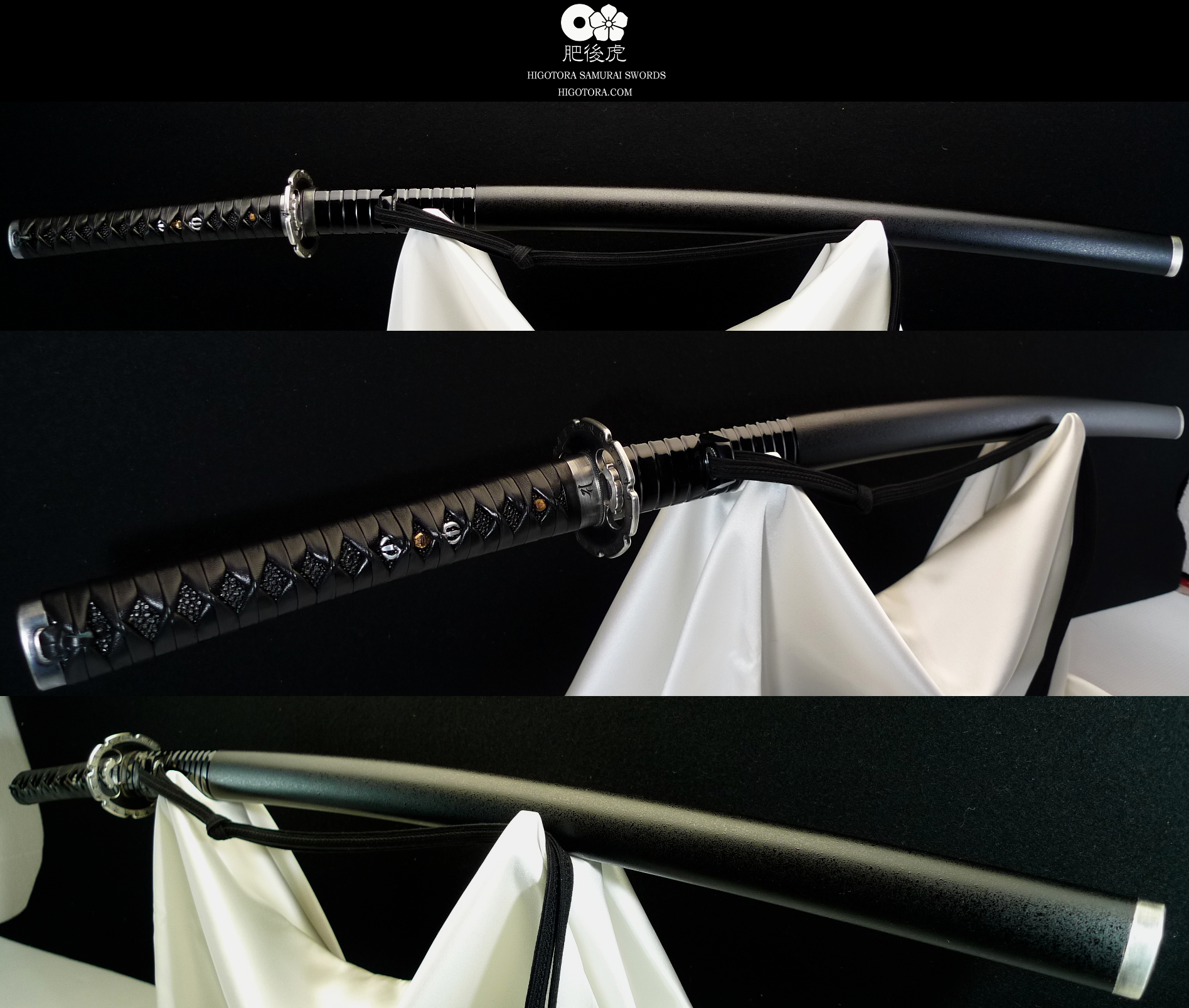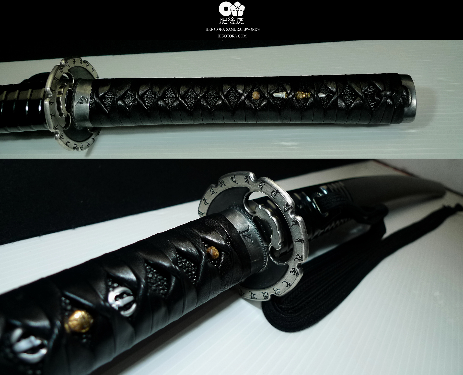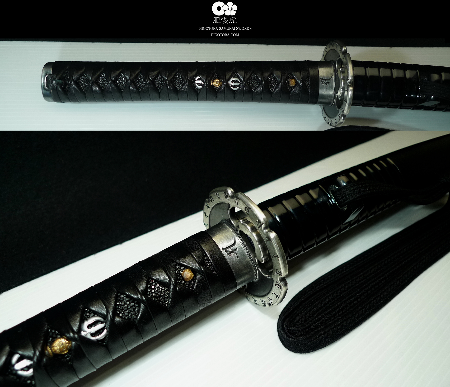 8寸5分柄 / 柄糸・牛革・表革・黒 / 柄巻スタイル・捻り巻き / 部分千段・本黒呂・本黒石目塗分け鞘