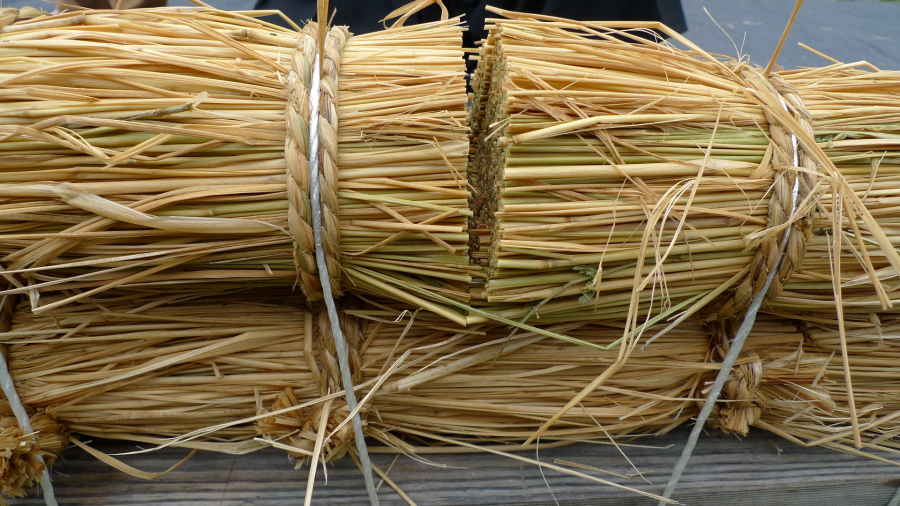 | 5 <土壇斬りの稽古> 本巻藁を2段積みにし、新心流の1本目の技、もしくは2本目の技(いずれも飛違い斬り)で、上の藁だけを斬り、下の藁を斬らずに止める稽古。 正しいフォーム、振り止め時の的確な手の内の絞り、気・剣・体がシンクロした身体操法等を錬るのに有効。 ![]() |