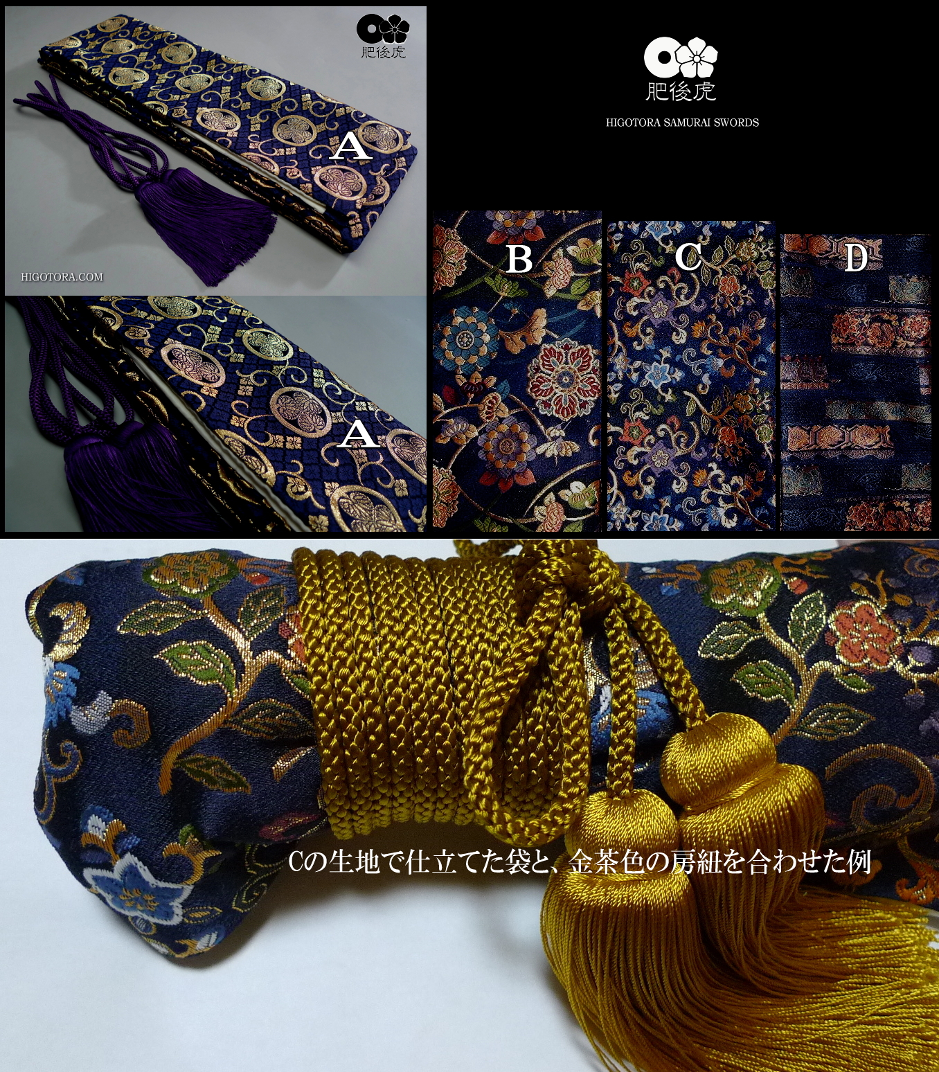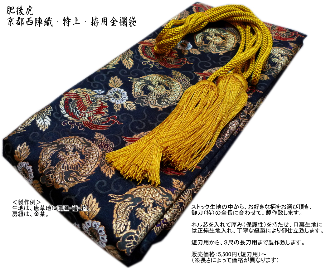 | ■【西陣織・特上・拵用金襴袋】 口裏白正絹生地入り、ネル芯入り 生地指定オーダーメイド (ストック生地は随時変化いたしておりますので、ご注文時に、Eメールにて生地の在庫状況をお問合せ下さい) 房紐が付属しませんので、別途お求め下さい。 9,000円(税別)〜 ![]() ![]() ![]() |