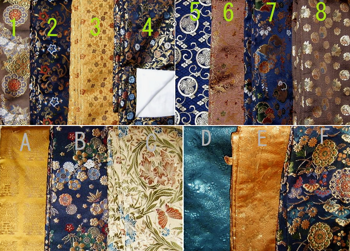 | <西陣織・特上・拵用金襴袋 生地サンプル> ※生地のストック状況は、常に変化しておりますので、ご注文時に、生地のストック状況をお問合せ下さい。 ![]() ![]() |
