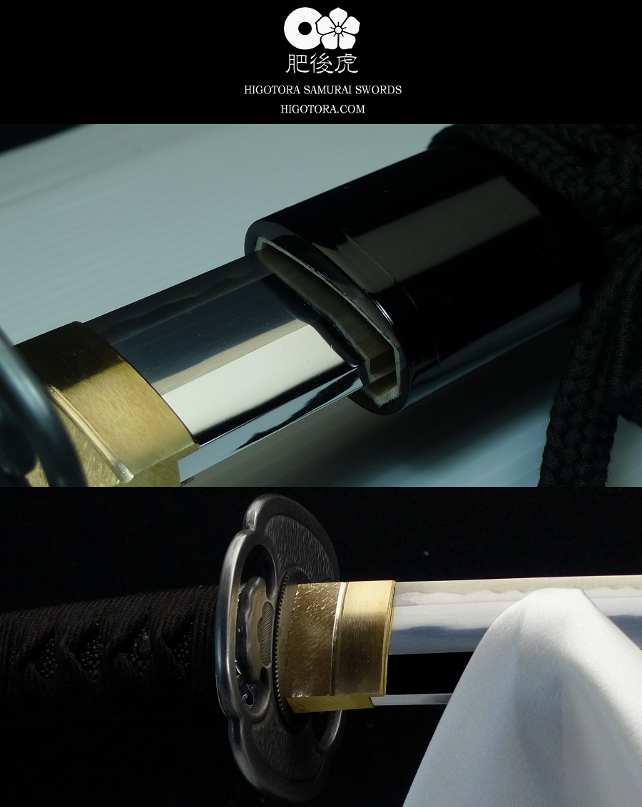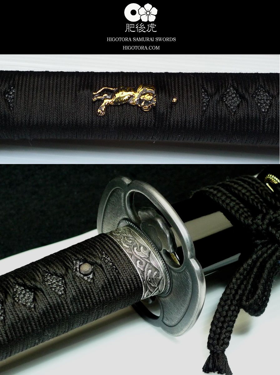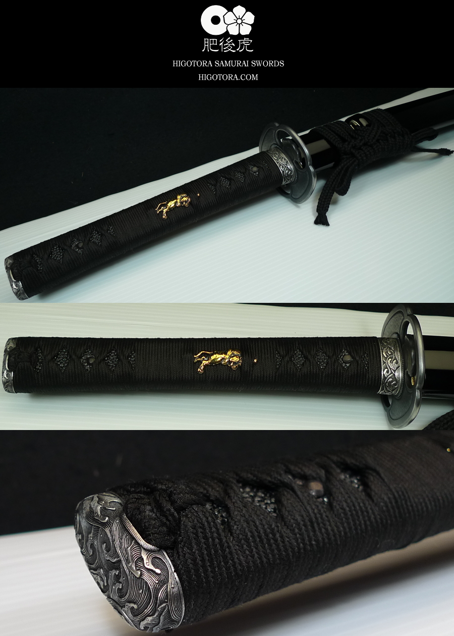 柄巻スタイル・一貫巻き / 黒蝋(本黒呂)塗り鞘 / 肥後平波銀古美縁頭 / 大虎目貫